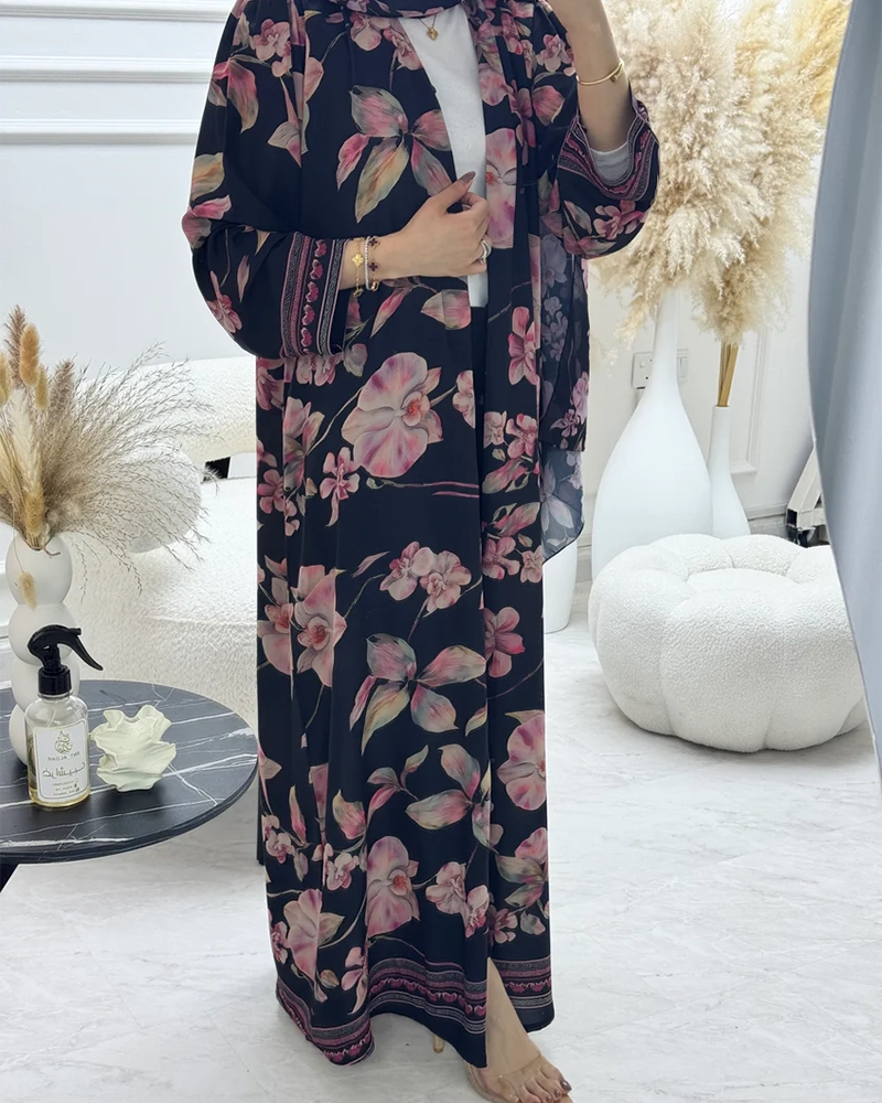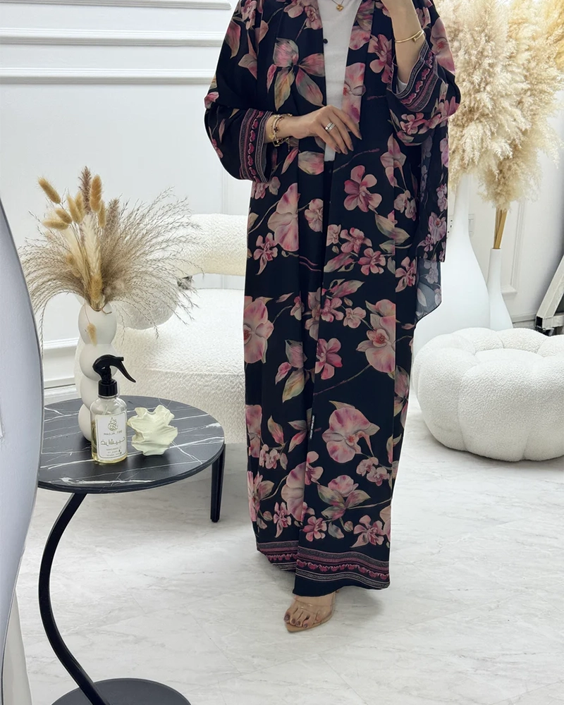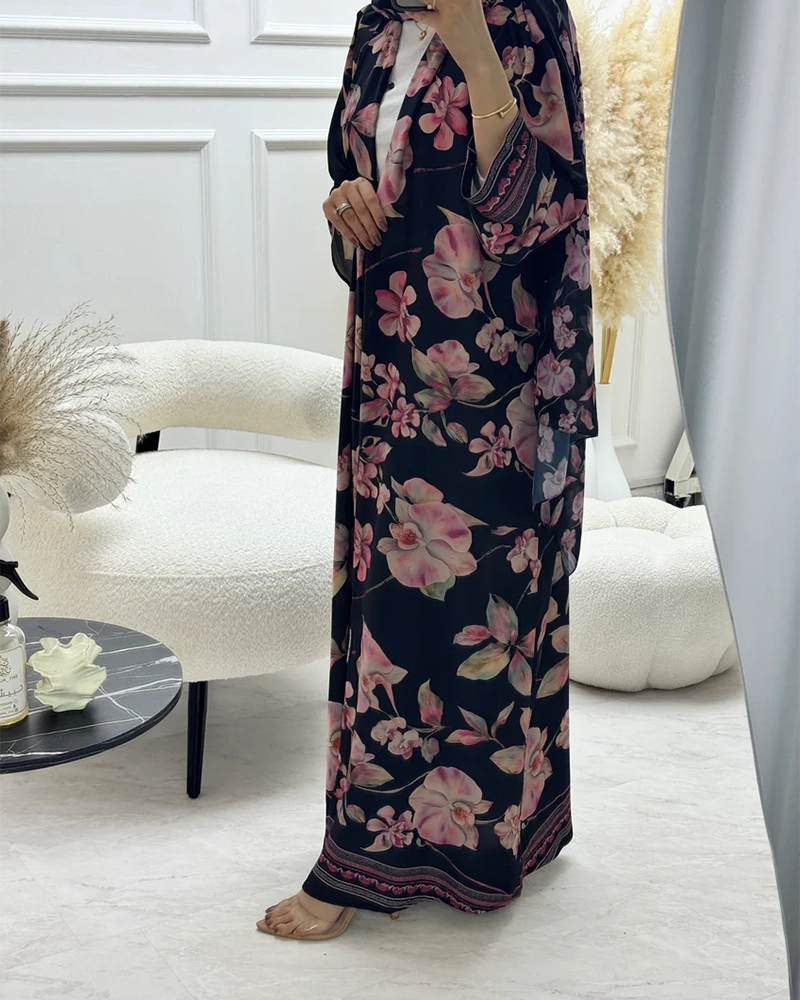 The Black Orchid Printed Abaya is a graceful statement piece designed for women who love bold floral elegance in a refined modest silhouette. Crafted in a classic black shade, this abaya is beautifully enhanced with soft orchid-inspired prints in warm pink tones, creating a rich contrast that feels feminine, stylish, and sophisticated. The detailed printed borders on the sleeves and front edges add an extra touch of definition, giving the overall design a polished and elevated finish.
