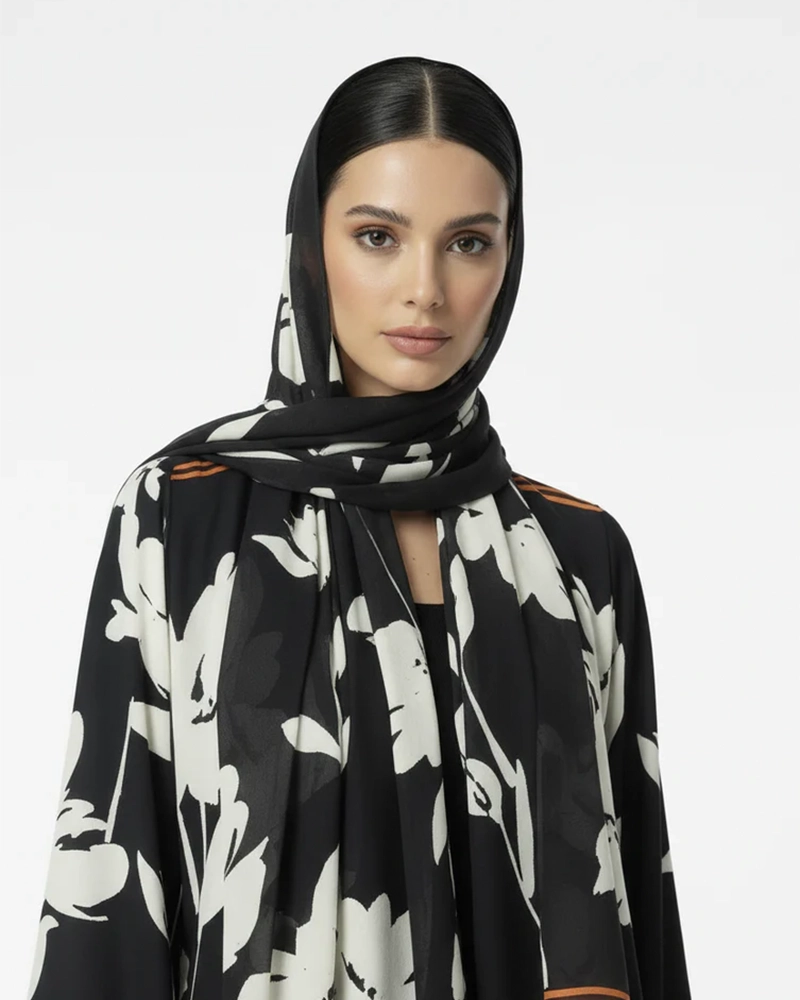 The Black White Floral Printed Abaya is a graceful statement piece with a flowing fit, bold floral pattern, and elegant printed border details. It combines modesty, comfort, and standout style, making it perfect for both special occasions and refined everyday wear.