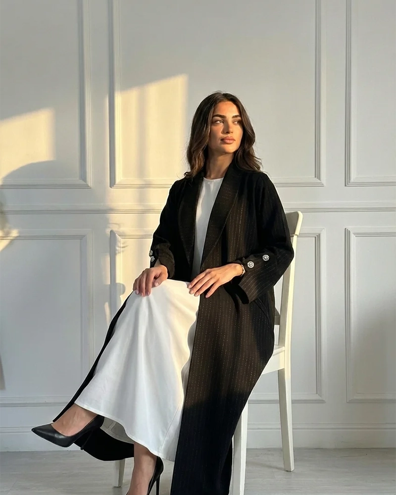 The Black Work Coat Abaya is a chic and timeless piece with a tailored, coat-inspired design, elegant textured fabric, and graceful flowing fit. Perfect for work and formal wear, it offers modesty, comfort, and effortless sophistication in one look.
