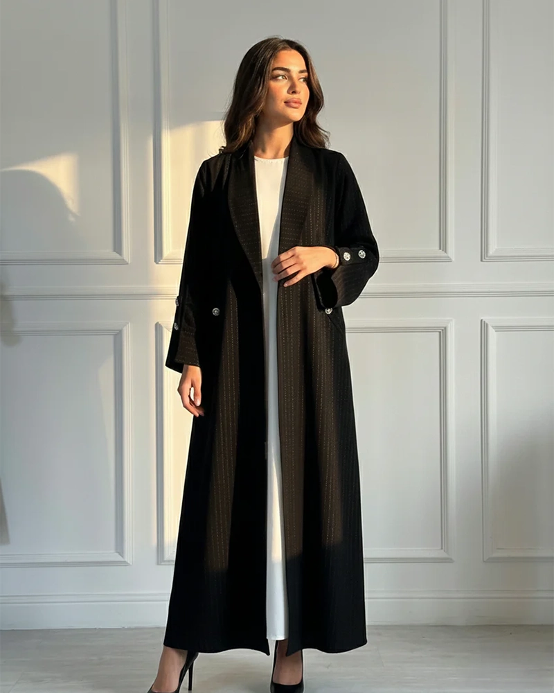 Its flowing cut drapes beautifully on the body, offering comfort, modest coverage, and effortless movement throughout the day. The structured shawl-style collar enhances the smart appearance of the abaya, while the decorative button accents on the sleeves bring a delicate touch of detail. Easy to style over inner dresses or simple everyday outfits, this abaya is ideal for office wear, formal visits, gatherings, and elegant daily dressing. It is a versatile wardrobe essential that combines confidence, comfort, and understated luxury in one timeless design.