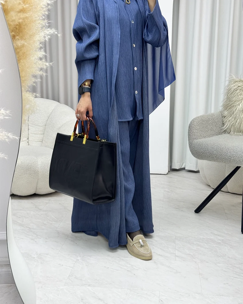 The Cobalt Blue Travel Set Abaya is a refined and comfortable coordinated set with a flowing fit, textured fabric, and elegant button details. It is perfect for women who want a stylish, practical, and travel-ready modest look.