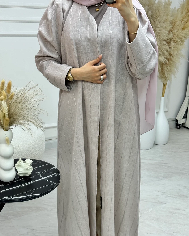 The Lavender Mist Travel Abaya is a graceful open-style abaya with a flowing fit, soft textured finish, and elegant muted tone. It is perfect for women who want a fresh, comfortable, and sophisticated modest look for travel and everyday wear.