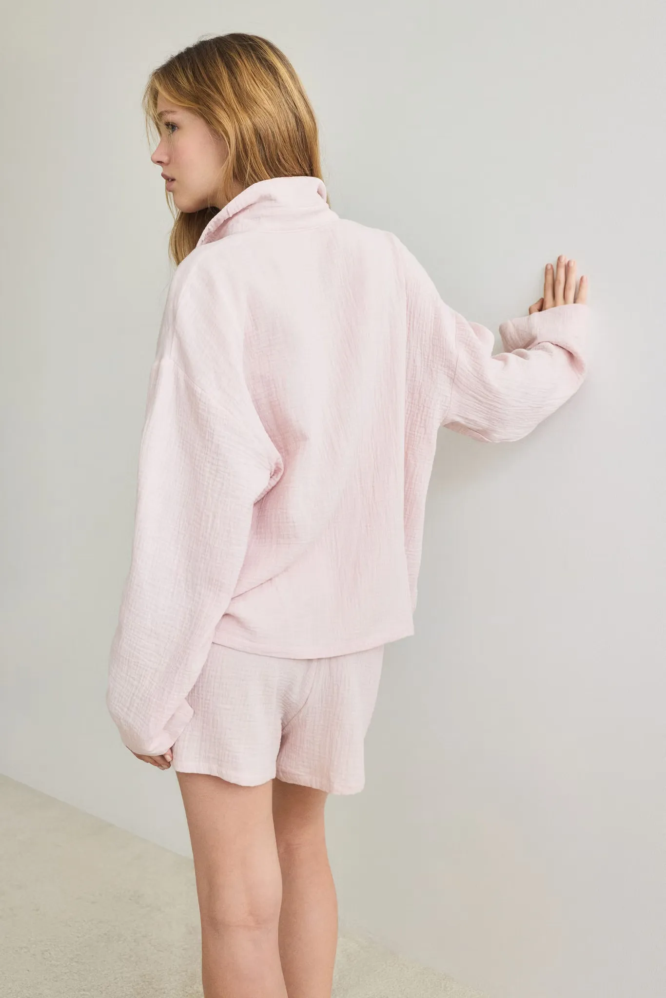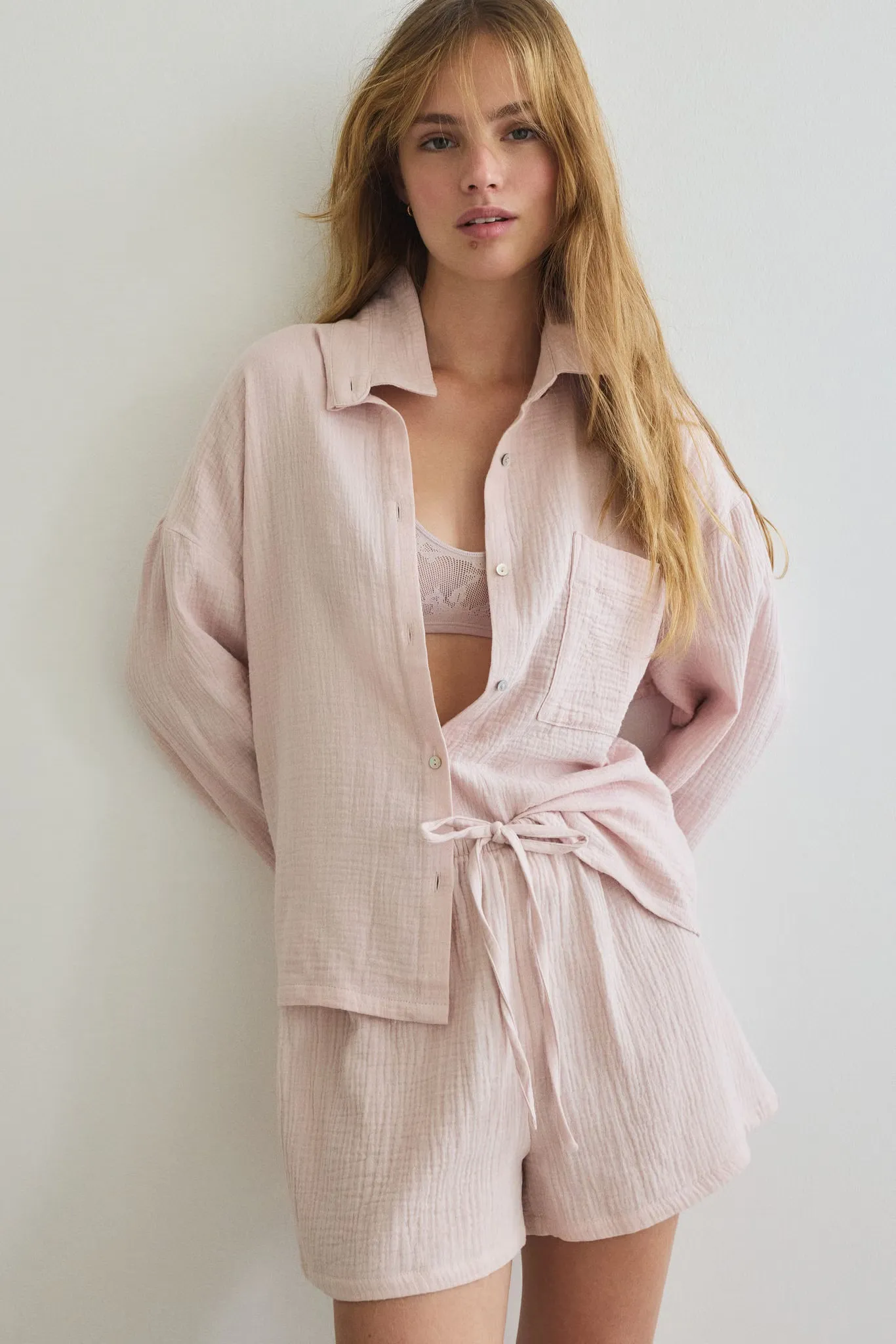 The Shorts Pajama Set is a soft and stylish loungewear essential designed for women who love comfort with a light, feminine touch. Featuring a gentle blush pink shade, this set includes a relaxed button-front shirt and matching shorts that create an effortlessly coordinated and modern look. The lightly textured fabric adds a soft, airy feel, making it perfect for relaxing at home, unwinding after a long day, or enjoying restful sleep in comfort.